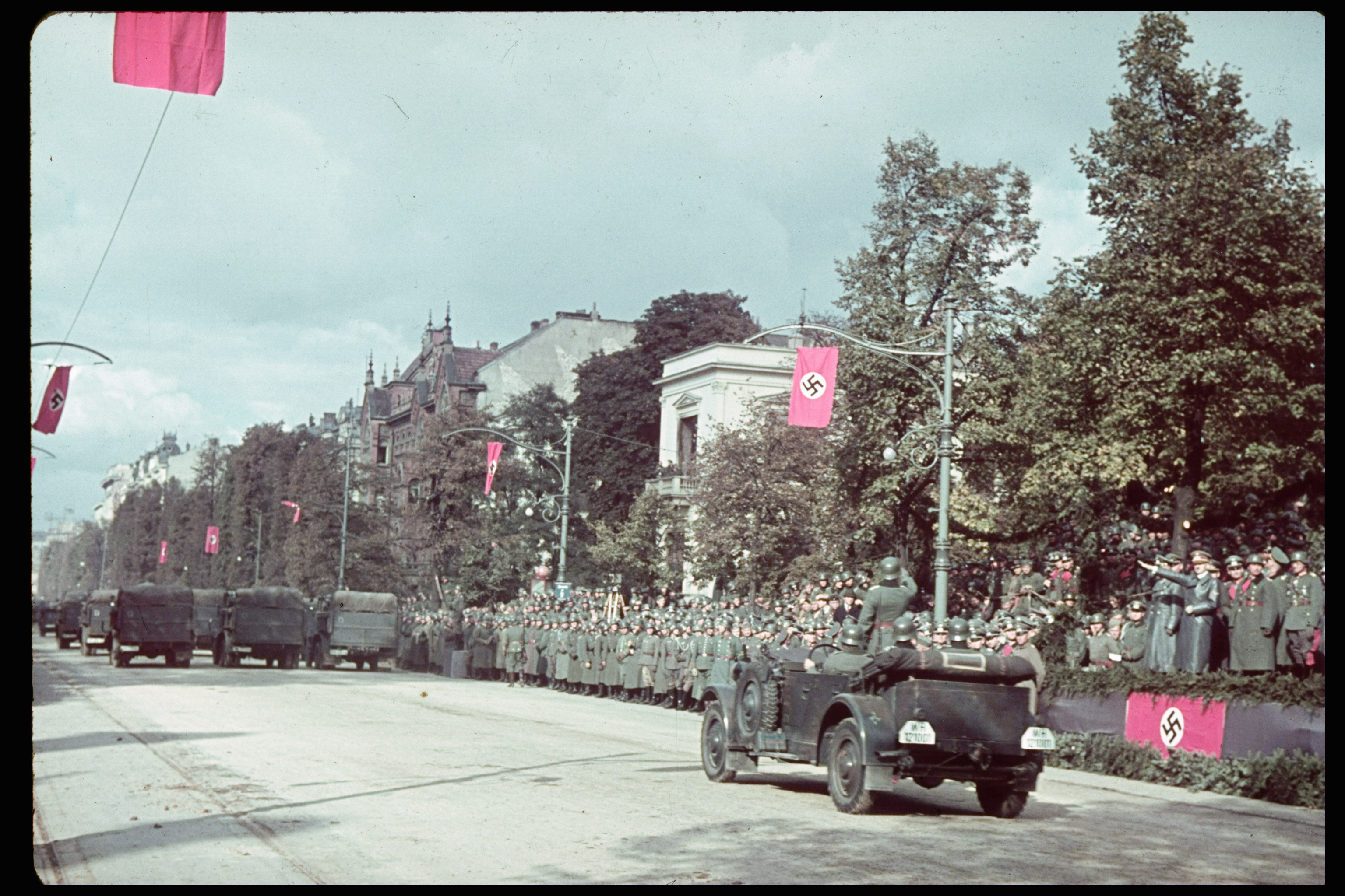 Defilada wojsk niemieckich w Alejach Ujazdowskich. Po prawej stronie na platformie Adolf Hitler.