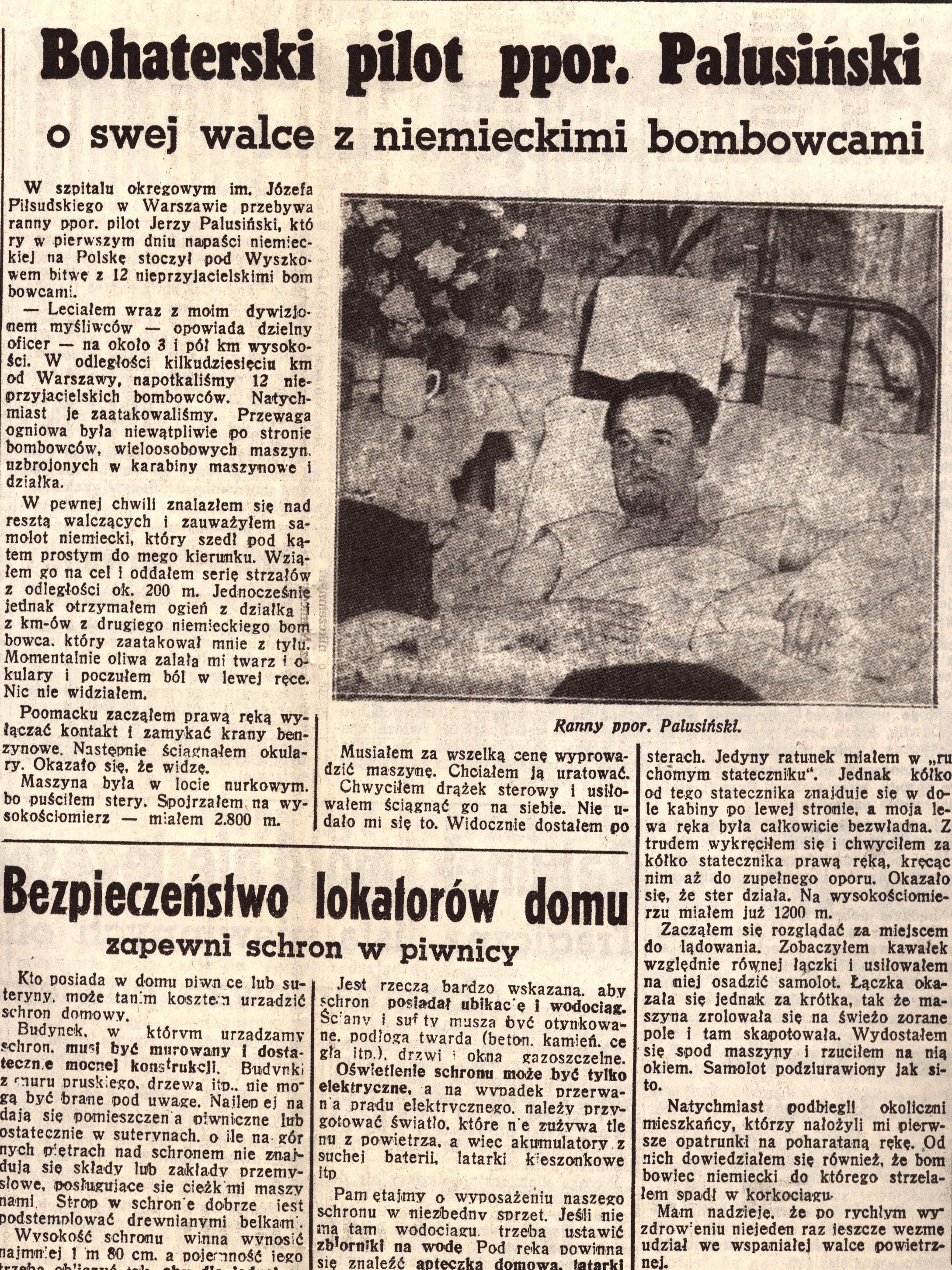 Artykuł na temat pilota ppor. Palusińskiego, który jako jeden z pierwszych toczył walki powietrzne z niemieckim lotnictwem.