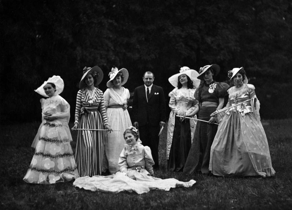 Prezydent Warszawy Stefan Starzyński w towarzystwie grupy uczestniczek przyjęcia w ogrodzie w Królikarni. Widoczne m.in. malarki: Eleonora Lipko (pierwsza z lewej), Jadwiga Tereszczenko (druga z lewej) i Nina Herget (trzeci z lewej). Maj 1936 rok.