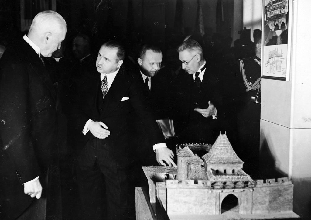 Wystawa pt. "Warszawa wczoraj, dziś i jutro" w Muzeum Narodowym w Warszawie. Zwiedzanie wystawy. Przy makiecie przedstawiającej rekonstrukcję dawnego barbakanu z Bramą Nowowiejską widoczni od lewej: prezydent RP Ignacy Mościcki, prezydent Warszawy Stefan Starzyński, dyrektor Muzeum Narodowego w Warszawie Stanisław Lorentz, minister wyznań religijnych i oświecenia publicznego Wojciech Świętosławski. 13 października 1938