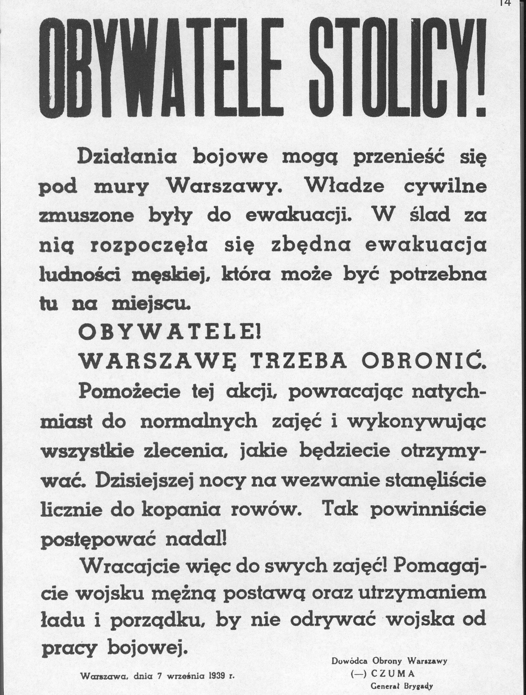 Odezwa gen. Czum, Dowódcy Obrony Warszawy do mieszkańców, wzywająca do obrony Stolicy, 7 września 1939 roku.