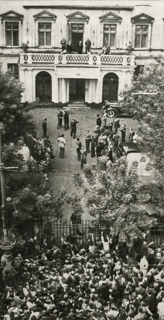 Manifestacje poparcia przed budynkiem ambasady brytyjskiej przy ul. Nowy Świat 18 w dniu przystąpienia Wielkiej Brytanii do wojny, 3 września 1939.
